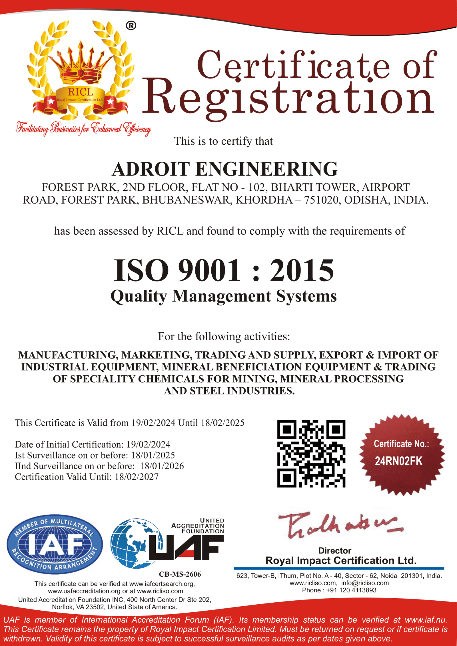 At Adroit Engineering, we are committed to maintaining the highest standards in quality and reliability. Our ISO Certification reflects our dedication to continuous improvement and customer satisfaction.